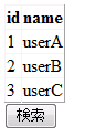 検索ボタンを押すと、以前に作ったuserテーブルの全データを表示します。